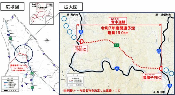 同じ北海道の北部、北海道縦貫道の延伸部分、「音威子府(おといねっぷ)IC~中川IC」の19.0km(音中道路)も、今年度中の開通が期待されているが、まだ正式発表はされていない。