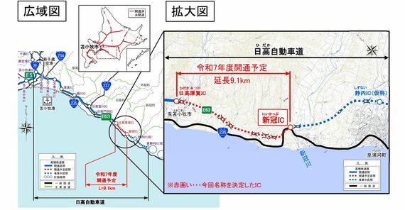 苫小牧から南東側へ、太平洋沿いに少しずつ路線を延ばしている北海道の日高自動車道は、現在「日高厚賀IC」まで開通している。その先、「新冠(にいかっぷ)IC」までの9.1kmの開通も今年度内とされているが、1月24日現在、まだ開通日は発表されていない。