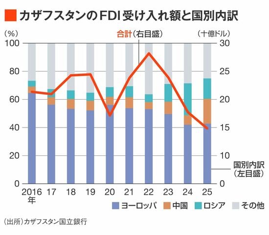 ここでカザフスタンのFDI受け入れ額の推移を確認すると、2025年は637.4億ドルと、近年の世界的なFDIの不調もあり、3年連続で減少した。