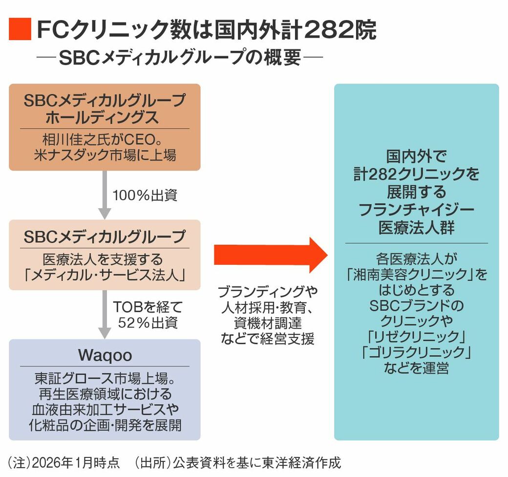 FCクリニック数は、26年1月時点で国内外282院となった。クリニック数で美容医療業界2位のTCB東京中央美容外科グループは約100院。SBCメディカルグループは業界内で頭一つ抜けた存在だ。