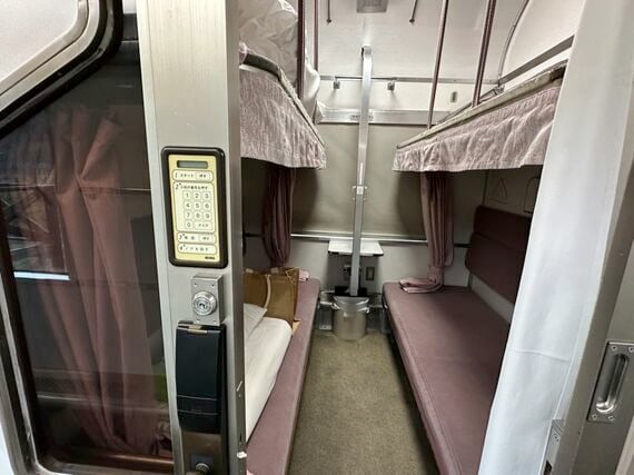 1両めはロビーカーやシャワールームが設置された車両で、ソロの個室もあるが、こちらはロッカーとして使用。2両めが寝るための車両で、開放B寝台をセミコンパートメントに改造してある。開放寝台ごとに入り口に扉と鍵が付いていて、個室のようになっているから安心だ。
