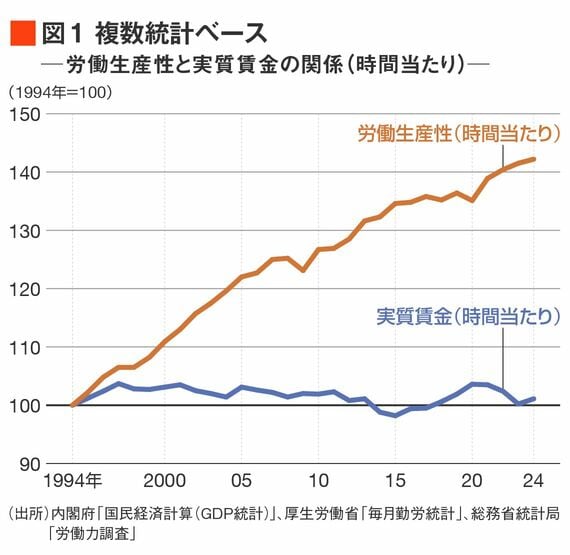 たとえば一般的には、実質賃金は毎月勤労統計(厚生労働省)、労働生産性(実質GDP÷労働投入量)はGDP統計(内閣府)の実質GDPと毎月勤労統計(厚生労働省)の労働時間、労働力調査(総務省統計局)の労働者数の組み合わせ、労働分配率は法人企業統計(財務省)、交易条件は企業物価指数(日本銀行)を使うことが一般的だ。