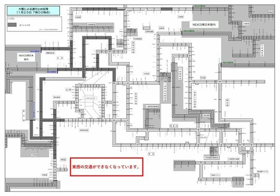この原稿を書いたのは1月25日。この日、午前7時にNEXCO中日本・西日本のホームページをチェックすると、通行止めの区間が路線図上で示されるとともに、赤字で「東西の交通ができなくなっています」というかなり強めの警告が表示されていた。