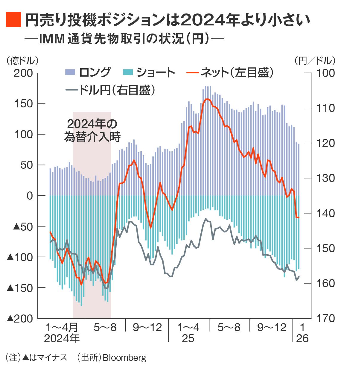 例えばIMM通貨先物取引における26年1月20日時点の円ポジションは約35億ドルのネットショート(円売り超過)だが、24年4~7月は平均118億ドルのネットショートが構築されていた。当時は100億ドル規模のネットショートが常態化していたのである。