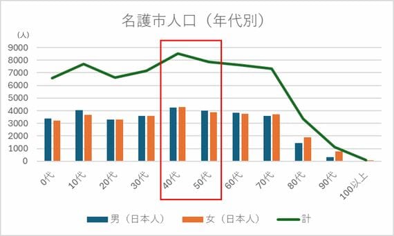そこで気になるのは、15年に65歳以上の老年人口が14歳以下の年少人口を上回って以来、人口ピラミッドの「釣鐘型」化が進む名護市に、国民民主党などを支持する若年層がどれほどいるのかということだ。下のグラフ2は、現在の名護市の年代別人口を表している。