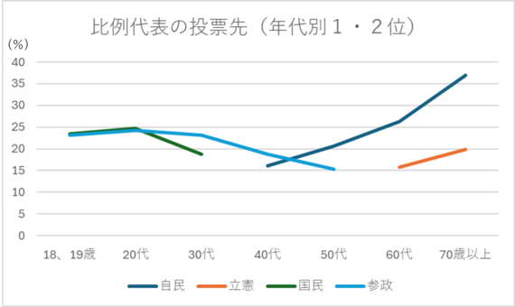 下のグラフ1は、25年7月20日に投開票された参議院選挙における各政党の得票率を年代別に1位、2位のみ示したものだ。自民党の主な支持層は40代以上、国民民主党の主な支持層は10代から30代、立憲民主党の主な支持層は60代以上となった。