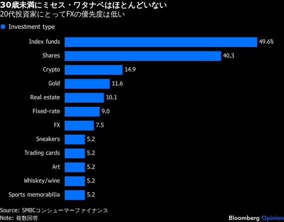 SMBCコンシューマーファイナンスの調査では、20代の男性で投資をしているのは3分の1にとどまり、女性では20%未満だった。投資先の大半は株式やインデックスファンドで、通貨は7位と、スニーカーやトレーディングカードをわずかに上回る程度だ。