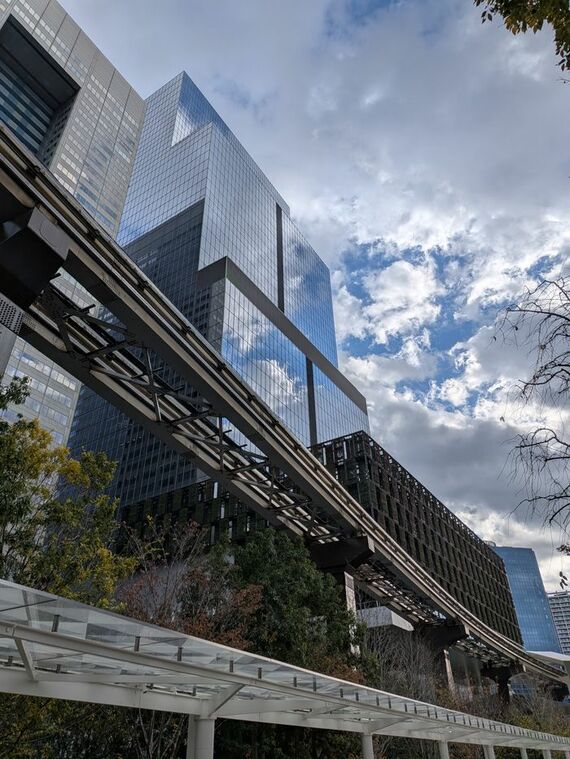 浜松町駅から徒歩で数分。開放的なデッキを歩いていくとモノレールの線路越しにブルーフロント芝浦が見えてくる。デッキの横道には、さながら緑道のような形で道が枝状に伸びているところもあり、テーマ通りの設計となっている。見上げればモノレール、デッキの横にはいくつもの在来線、新幹線が走っており間近で鉄道を見られる一角もあった。