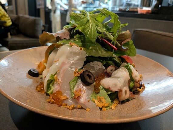 先に届いたビールとサラダで乾杯。濁ったIPAは飲みごたえ抜群、大ぶりな刺身がたくさんのったサラダと一緒にいただくと、さらにおいしい。刺身はまぐろにタコ、つぶ貝にサーモンなど種類も充実している。