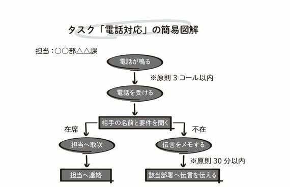 ここでは、簡単な図解を取り入れるといいでしょう。あえてどなたでも、なじみのある「電話応対」の例で単純化してお伝えします。