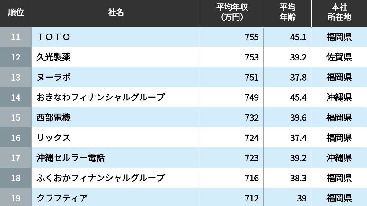 九州・沖縄地方のトップはRKB毎日ホールディングス(1197万円)。2位に三井松島ホールディングス(1079万円)、3位にトライアルホールディングス(1025万円)が続き、トップ3が1000万円台となった。