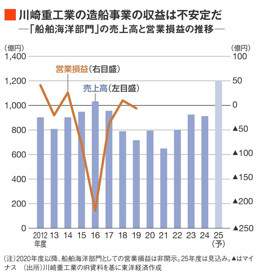 事実、川崎重工にとって造船は長きにわたり荒波に耐え続けるような事業だった。造船部門の売り上げは年によって大きく波を打ち、営業利益は開示されていた19年度まで赤字を繰り返していた。