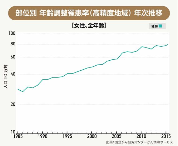 乳がんの5年生存率を見ると、ステージ1では95%近くだ。進行すればするほど生存率が下がるだけに、検診による早期発見が大事になってくる。