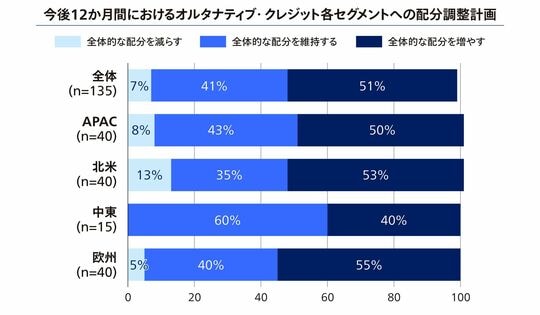 「調査では、2025年に続き、2026年もオルタナティブクレジットのアセットアロケーションを増やすと回答した機関投資家が半数以上となっています」とベヴァン氏。実際、調査結果を見ると、過去12カ月で「配分を維持または増やした」と回答している割合は95%だった。「アセットクラスのサブカテゴリーと地理的条件の両面において、分散投資への意欲が顕著に高まっています。具体的には、これまではダイレクトレンディングに重きが置かれてきたサブカテゴリーでは、インフラデット、ローン担保証券(CLO)、商業用不動産、そしてスペシャルシチュエーションへの関心がいずれも拡大傾向にあります。