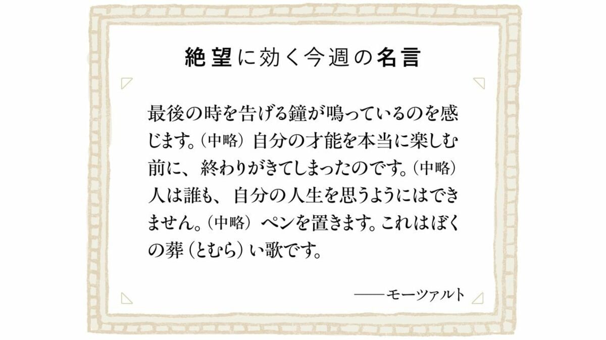 ところが、そのモーツァルトが亡くなる前に、「自分の才能を本当に楽しむ前に、終わりがきてしまった」と手紙に書いているのだ。この手紙は誰に宛てたものかわからない(モーツァルトのオペラのうち3つ台本を書いたダ・ポンテへの手紙ではないかと言われている)。写ししか残っておらず、本当にモーツァルト自身が書いたものかどうかもわからない。しかし、この頃のモーツァルトの心境をよく表しているとされ、モーツァルトの書簡集にも収録されている。