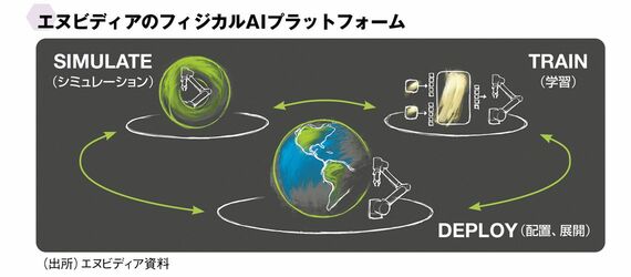 実はエヌビディアの強みはGPUというより、AI開発プラットフォームにある。同社が「3つのコンピューター」と呼ぶのが「学習、シミュレーション、配置(エッジAI)」の循環。中でも肝は、シミュレーションだ。