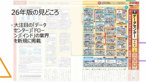 『業界地図 2026年版』の最大のポイントは、過去最多となる194業界を掲載していることです。その内容も、データセンター、ドローン、インド、自動車(中国)、など、話題の業界を多数掲載しています。