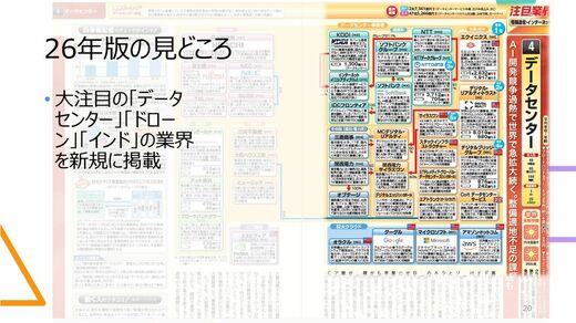 『業界地図 2026年版』の最大のポイントは、過去最多となる194業界を掲載していることです。その内容も、データセンター、ドローン、インド、自動車(中国)、など、話題の業界を多数掲載しています。