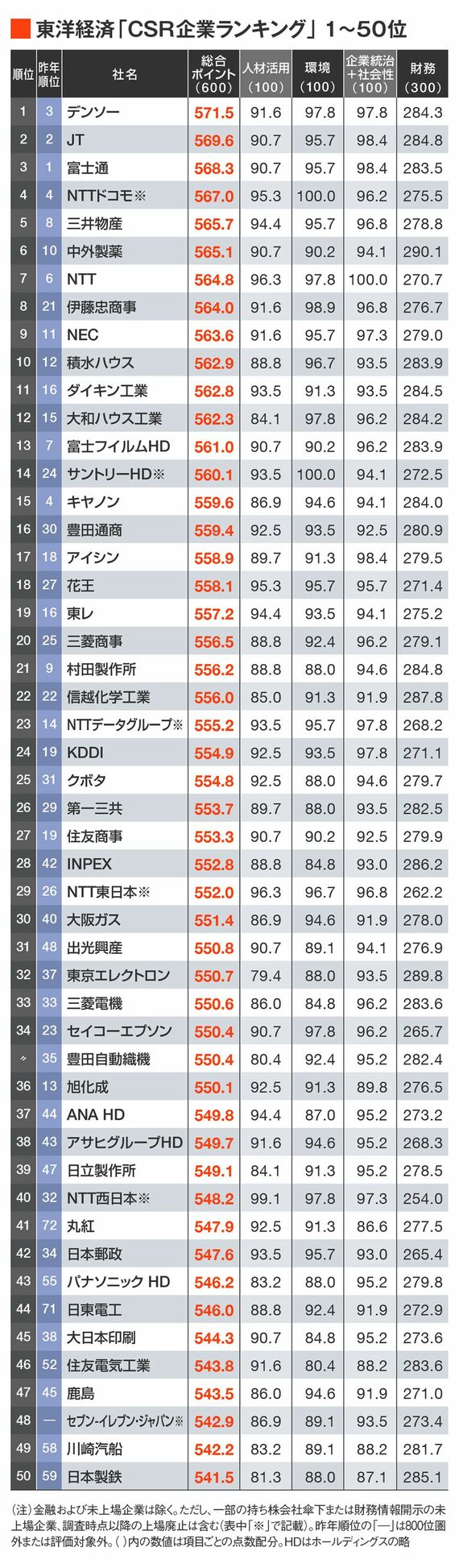 東洋経済「CSR企業ランキング」1~50位