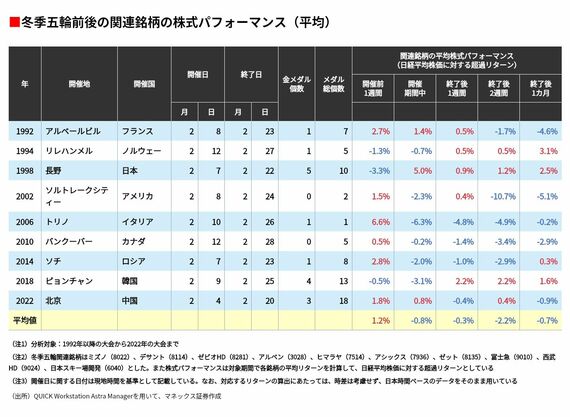次の表では、1990年代以降に行われた9回の冬季五輪を対象に、冬季五輪関連銘柄の株価パフォーマンスをまとめています。