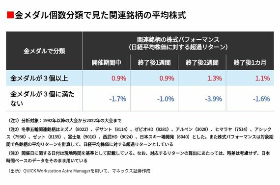 一方、金メダル数が3個に満たなかった大会を平均すると、開催期間中および五輪終了後のパフォーマンスはいずれもマイナスとなっています。