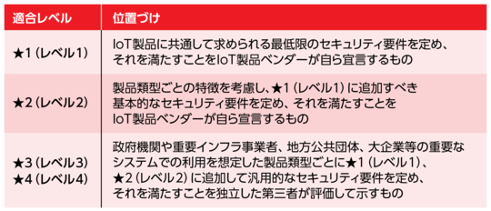 武尾:JC-STARは、IoT製品がセキュリティ基準に適合していることを可視化するラベリング制度です。主眼は、IoT製品を調達する際に、セキュアな製品を容易に選択できるようにすることです。2025年3月に、すべてのIoT製品に共通して求められる必要最低限のセキュリティ要件に適合していることを示す「★1(レベル1)」の申請受け付けから制度を始動させました。このレベル1では基準が16個あり、代表的なものとして「推測可能なデフォルトパスワードの禁止」「適切なアクセス制御」「守るべき情報資産の保護」などが挙げられます。加えて、将来的には4段階での適合性評価を行うことを目指しています。