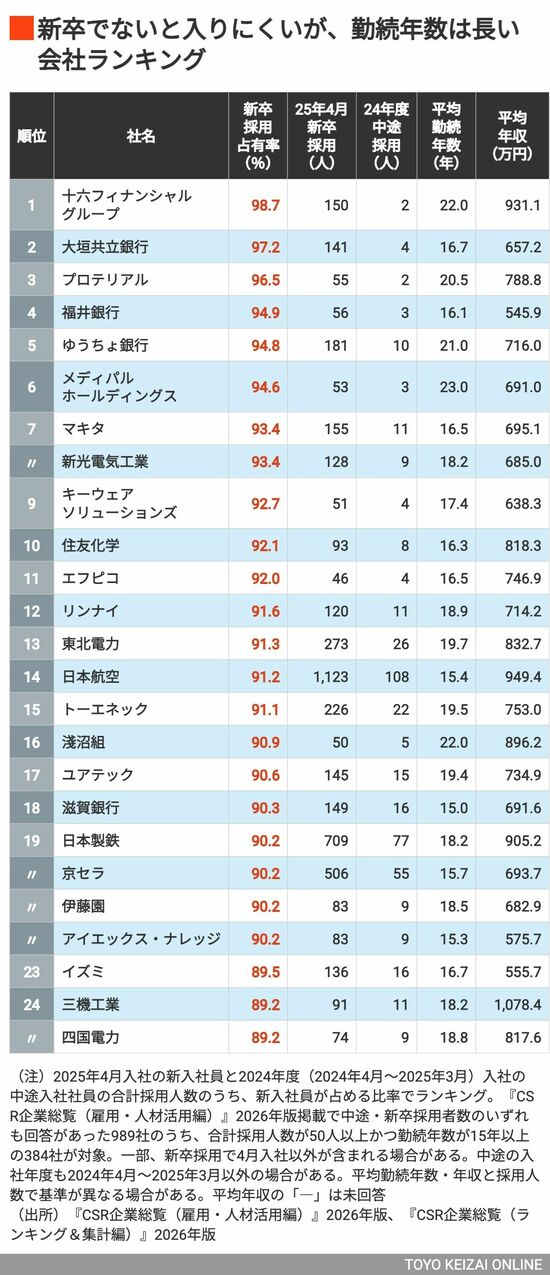 ビジネス #ダイジェスト版 前の記事 次の記事 新卒でないと入りにくいが、勤続年数は長い会社ランキング 5位ゆうちょ銀行、4位福井銀行、ではトップ3は? 4分で読める 公開日時:2026/02/13 06:00 山谷 明良 東洋経済データ事業局 フォロー 1/4 PAGES 2/4 PAGES 3/4 PAGES 1〜25位 次ページが続きます:【ランキング26〜50位】 4/4 PAGES
