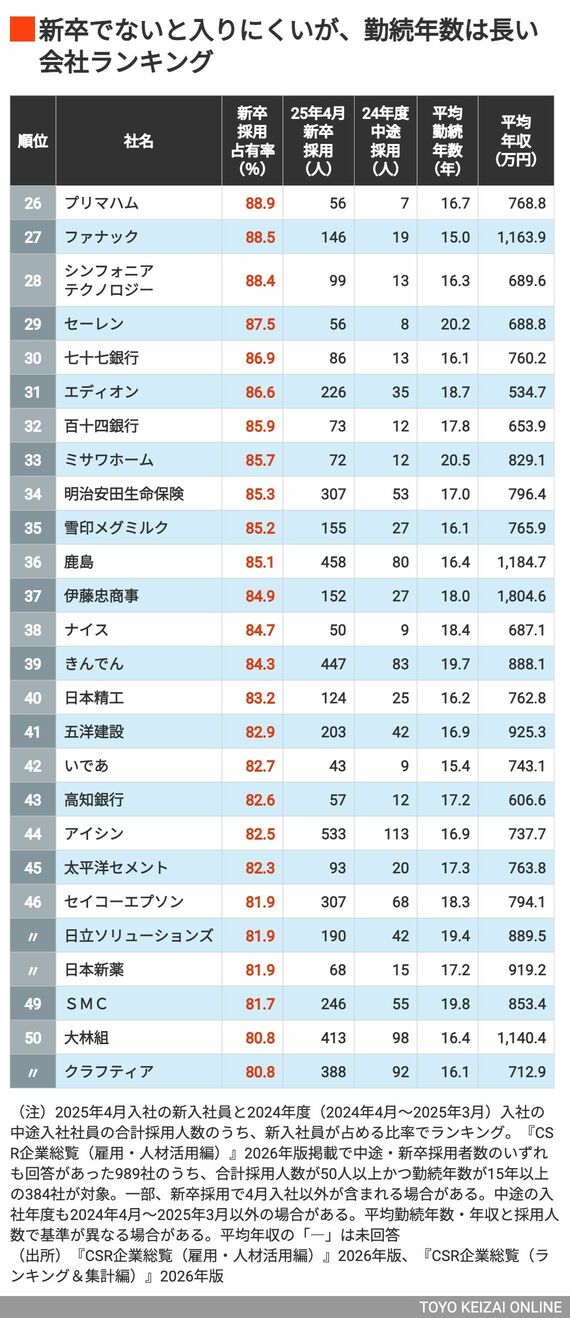 100位までのランキングは、「新卒でないと入りにくいが勤続年数は長い会社《完全版》」(有料会員登録が必要です)でご覧いただけます。