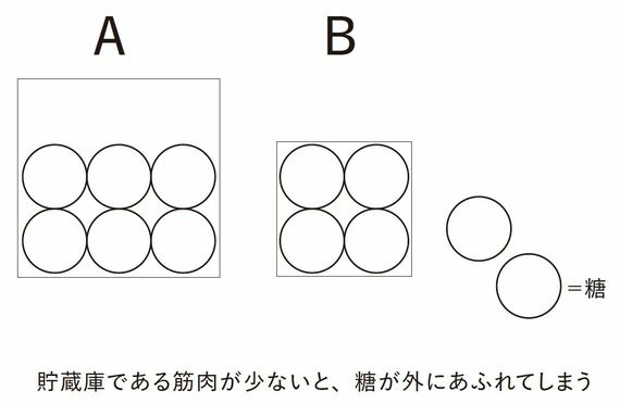 筋肉が多ければそれだけ貯蔵庫も大きく、小さければ貯蔵庫も小さいということです。でも、貯蔵庫が小さいと、ちょっと困ったことが起こります。下の図をご覧ください。
