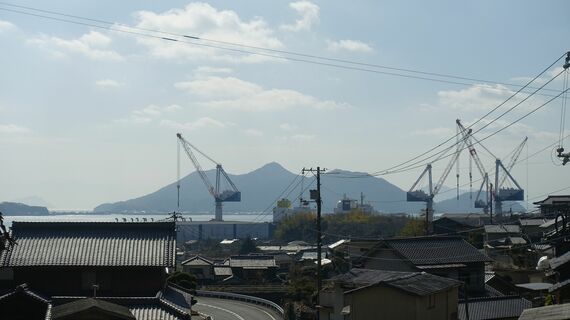 JR福山駅から車で30分。山間の集落を抜けると突然、巨大なジブクレーンが視界に飛び込んでくる。広島県福山市にある常石造船の新造船工場だ。創業は1917年。瀬戸内海に面したこの工場には、1基の船台と1基のドックがあり、協力会社を含めて約2000人が働いている。