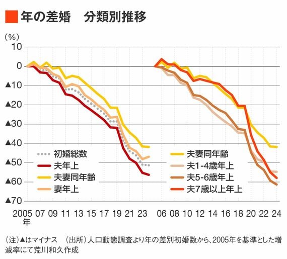 確かに、婚活と言う観点では同い年婚がもっとも減少幅は小さく、効率を考えれば同い年あたりを狙うのがいいという判断もありますが、実は深刻なのは1〜6歳夫年上婚の減少が著しいことです。