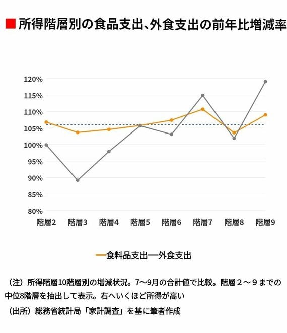 食品全体ではおおむね物価上昇率(青い点線、約7%)と同じくらい増えていて所得階層による違いはあまりないが、外食に関しては所得の少ない層ほど節約していて、高い層では逆に増やしているという傾向が見て取れると思う。