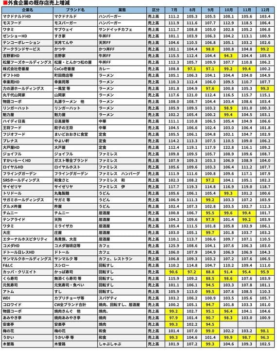 一方の客数版の表を見ると、表全体が黄色だらけなのに驚くのではないか。