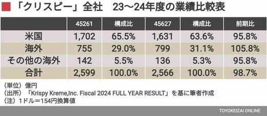 現在、クリスピー社全社の売り上げは2566億円(24年12月実績。1ドル≒154円換算値)と前年比1.2%程度のマイナス基調です。しかし、日本を含めて海外店舗が売り上げを伸ばし、全体を引っ張っています。