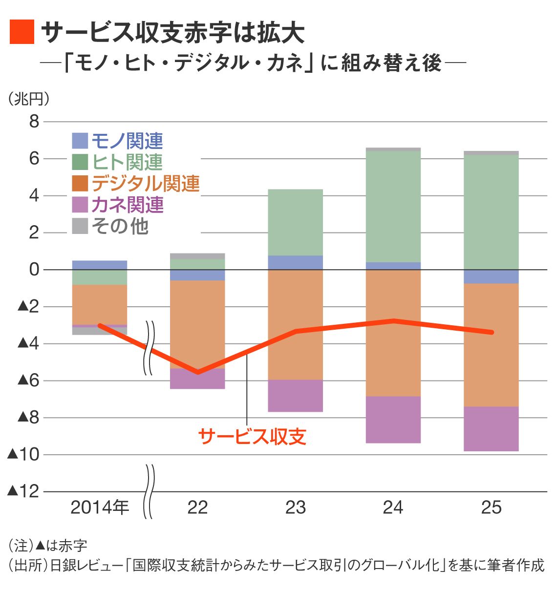 サービス収支をモノ・ヒト・デジタル・カネ・その他に切り分けた場合、おおむね旅行収支黒字に相当するヒト関連収支が約6.2兆円の黒字となる一方、デジタル関連収支は約6.7兆円の赤字を記録している。また、海外への再保険支払いから構成されるカネ関連収支の赤字も約2.4兆円まで膨らんでいるため、全体としてサービス収支赤字が広がる構図に至っている。