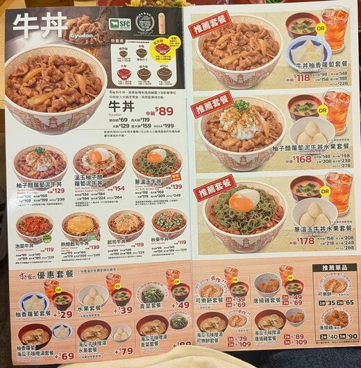 牛丼ページ。一見日本のメニューと変わらないように見えるが、セット内容に台湾の食文化が反映されている。ゆず大根セットやフルーツセット、青菜セットやコロッケセットまである。