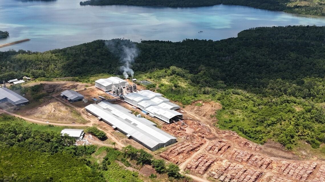 ──木質ペレット生産に関連する企業は、森林を皆伐した後にガマルという早生樹を植林し、緑の森にすると説明しています。