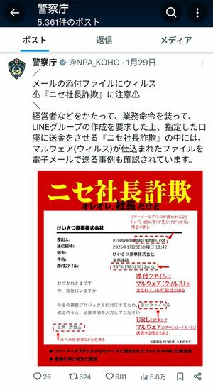 代表的なソーシャルエンジニアリングの1つに、「ビジネスメール詐欺」がある。最近急増している「ニセ社長詐欺」もその1つだ。社長になりすました攻撃者が部下に対して急いで振り込みを行うように指示を出す。実直な部下の心理をついた攻撃だ。最近はマルウェアが添付されているメールが送られてくるパターンもあるため、注意してほしい。