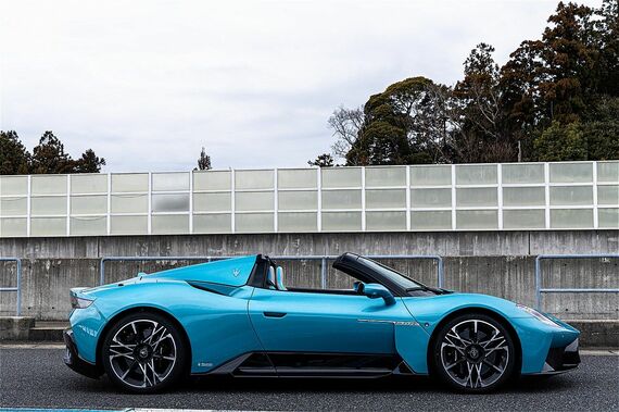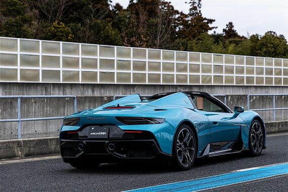 全長4667mm、全幅1965mm、全高1214mmと比較的コンパクトではあるものの、幅広く低い2人乗りの車体。全体の印象はMC20から大きく変わらない。タイヤの存在感が大きなボディは、強烈にスポーティなイメージだ。