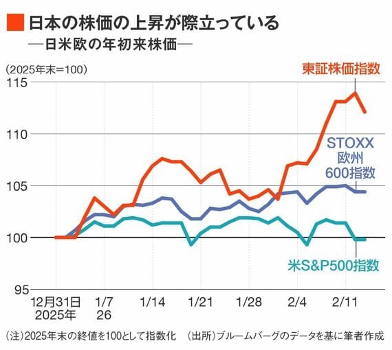2月8日の衆議院選挙の結果を受けて、日本株が活況を呈している。東証株価指数の年初からの上昇率は2月12日時点で約13%に達した。