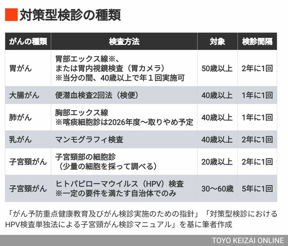 こうした要素をクリアした、以下の5つのがんに対する検診(ここでは「基本セット」と呼ぶ)が、厚生労働省が推奨する対策型検診として、部位・検査方法・対象者・検診間隔を決めて行われている(以下の表)。