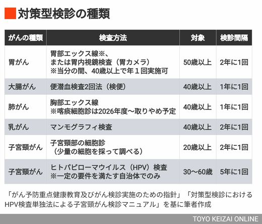 そのメニュー(ここでは「基本セット」と呼ぶ)は下記の通りで、いずれも、“検診を受けることで、受けなかった場合と比べてがんで死亡するリスクを減らせること”が証明された検査だ。職域検診や人間ドックにも含まれているが、対象者や検診間隔などが異なる場合がある。