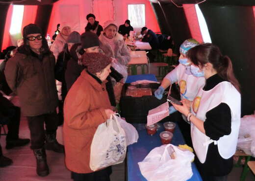 キーウ中心街から凍てつくドニプロ河を渡った東部地区。大型テントの避難所で、独り暮らしのボロディミールさん(84)はボルシチとパンを受け取って安堵の表情を浮かべた。