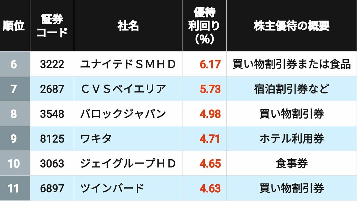 ランキングを概観すると、優待利回りが3%を超えているのは17銘柄、4%超は13銘柄だった。前述の配当利回りランキングでは、3%超が12銘柄、4%超が5銘柄だったので、利回りにフォーカスすれば配当よりも魅力的な銘柄が多いと考えることもできる。