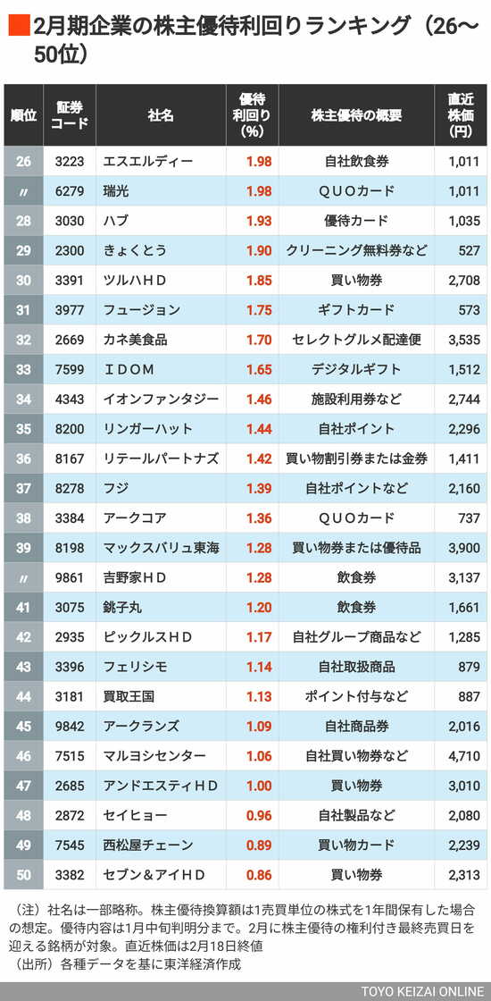 政治・経済・投資 今月は買い物・飲食の優待がドッサリ、首位は驚愕の利回り70%! 「株主優待の利回りが高い2月期企業」ランキングTOP50 3分で読める 公開日時:2026/02/23 07:00 東洋経済オンライン編集部 フォロー 1/3 PAGES 2/3 PAGES 3/3 PAGES 身近なスーパーや飲食店がランクイン (外部配信先ではランキング表をすべて閲覧できない場合があります。その際は東洋経済オンライン内でお読みください)