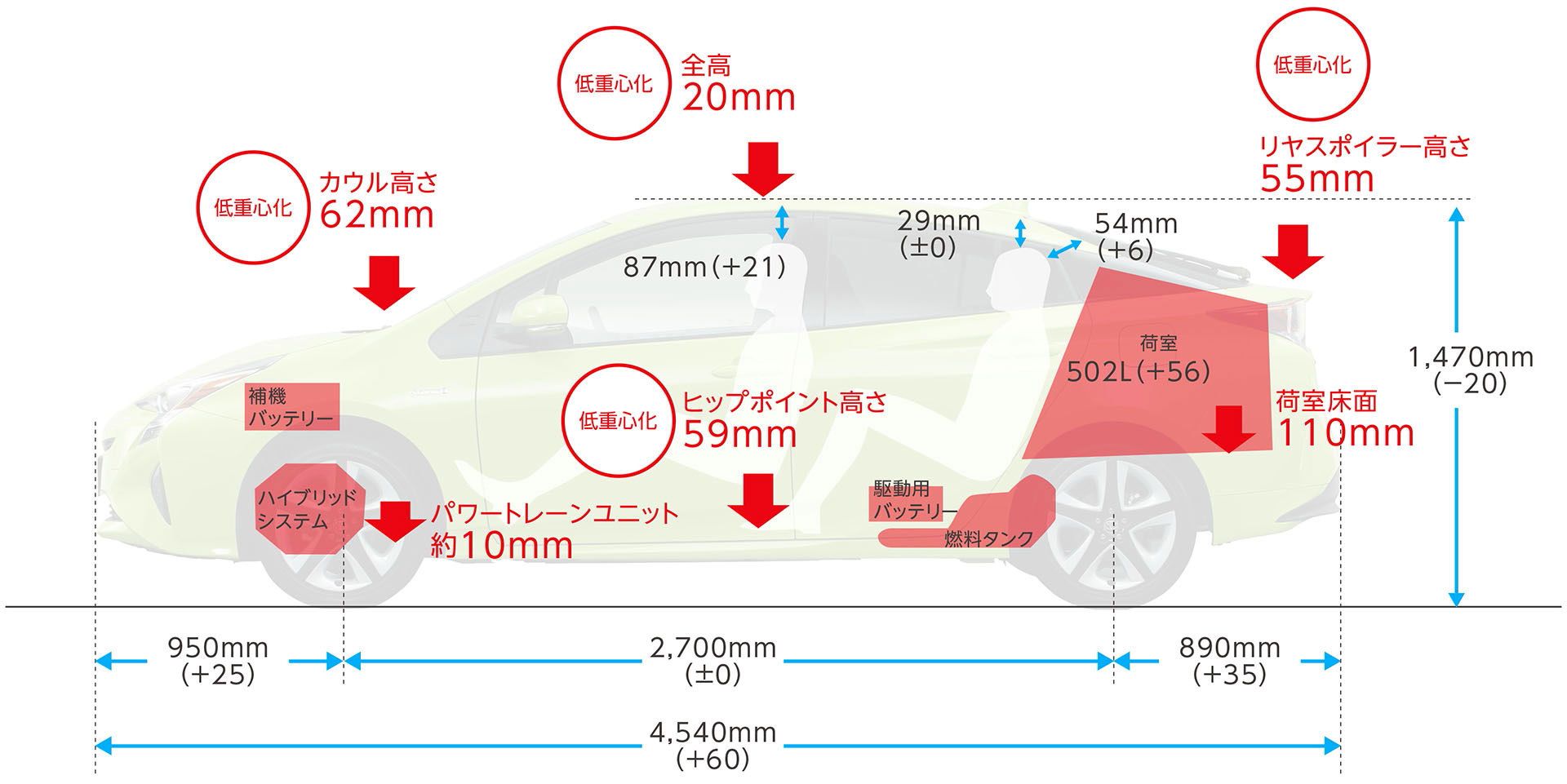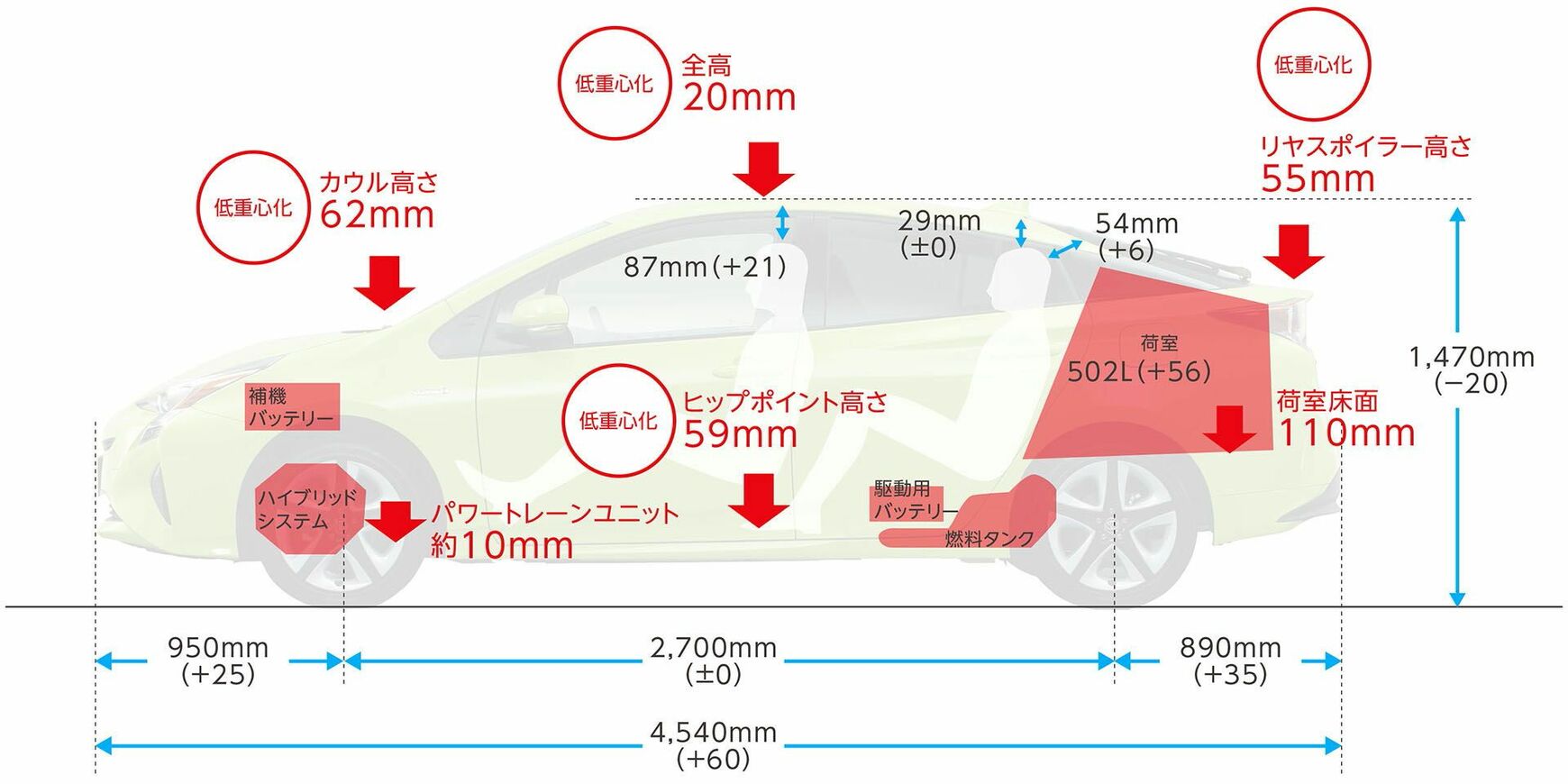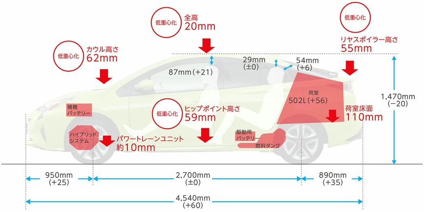 新開発のプラットフォーム(車台)やパワーユニットを採用、全高と重心高を3代目プリウスに比べて20㎜、運転席のヒップポイントを同59㎜も下げた