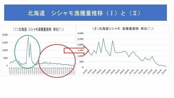 資源管理によりV字回復を続けるアイスランド産。次のグラフは、それと対照的な北海道でのシシャモの漁獲量推移です。左のグラフで緑の丸で囲んだ1980年前後には、一時的に資源量が増えて、漁獲量が増えていました。しかし、そのチャンスを活かすことなく、再び漁獲量が減っています。