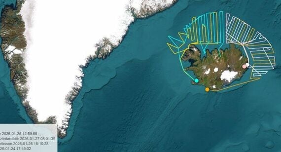 上図の線はアイスランド近海で調査船や漁船が、資源調査をした海域を示しています。アイスランドのシシャモ漁は2月から3月にかけて行われます。