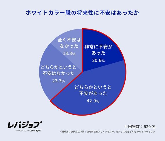 実際、レバレジーズの調査では、ホワイトカラーからブルーカラーへ転職した人の約6割が、ホワイトカラー職の将来性に不安を感じていたと回答している。不安の要因として最も多いのは、