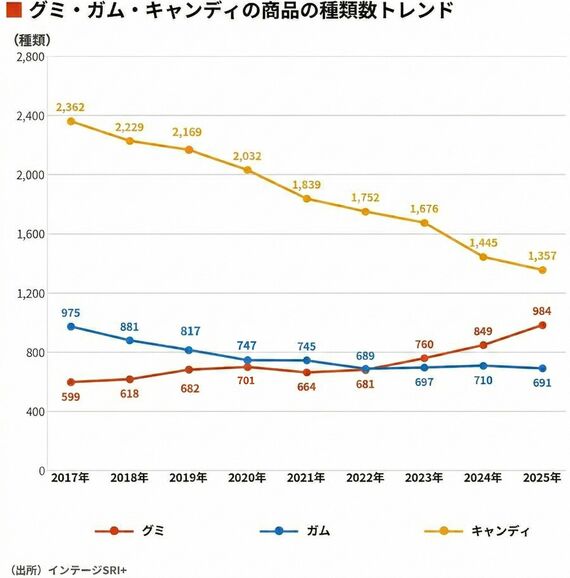 22年以降も2ケタ増を続けたグミの市場規模は、25年にはガムの2倍、キャンディをも上回る1297億円にまで増加した。グミは、加工のしやすさから、味だけではなく、形状やかたさなどの異なるさまざまな商品が販売されている。商品の種類数でみても、グミは23年にはガムを超え、キャンディとの差も縮小傾向だ。